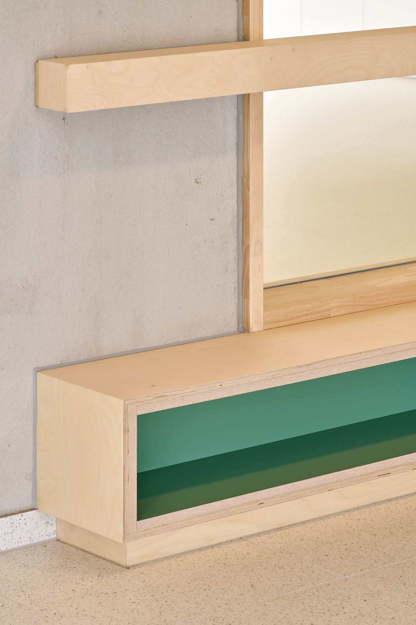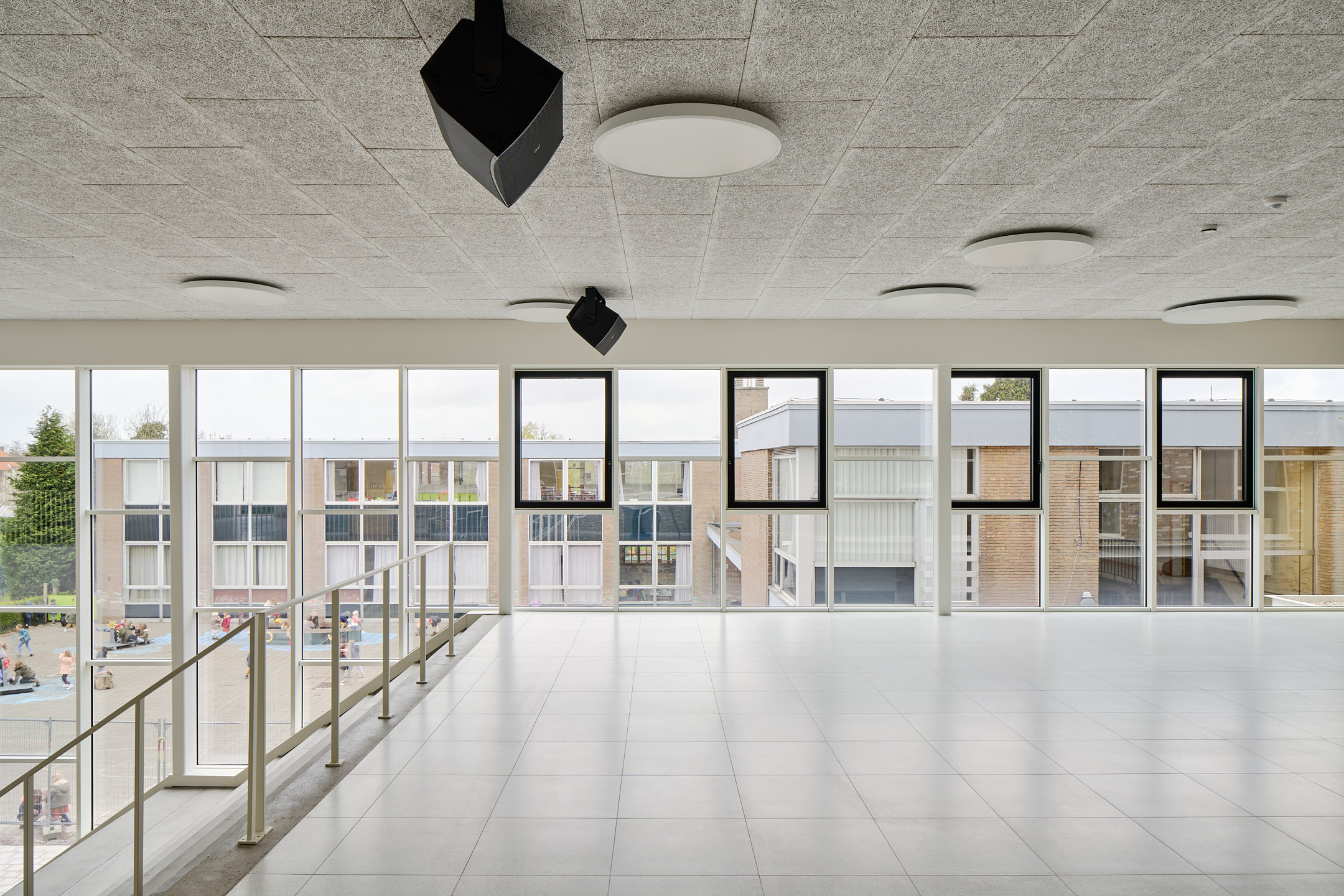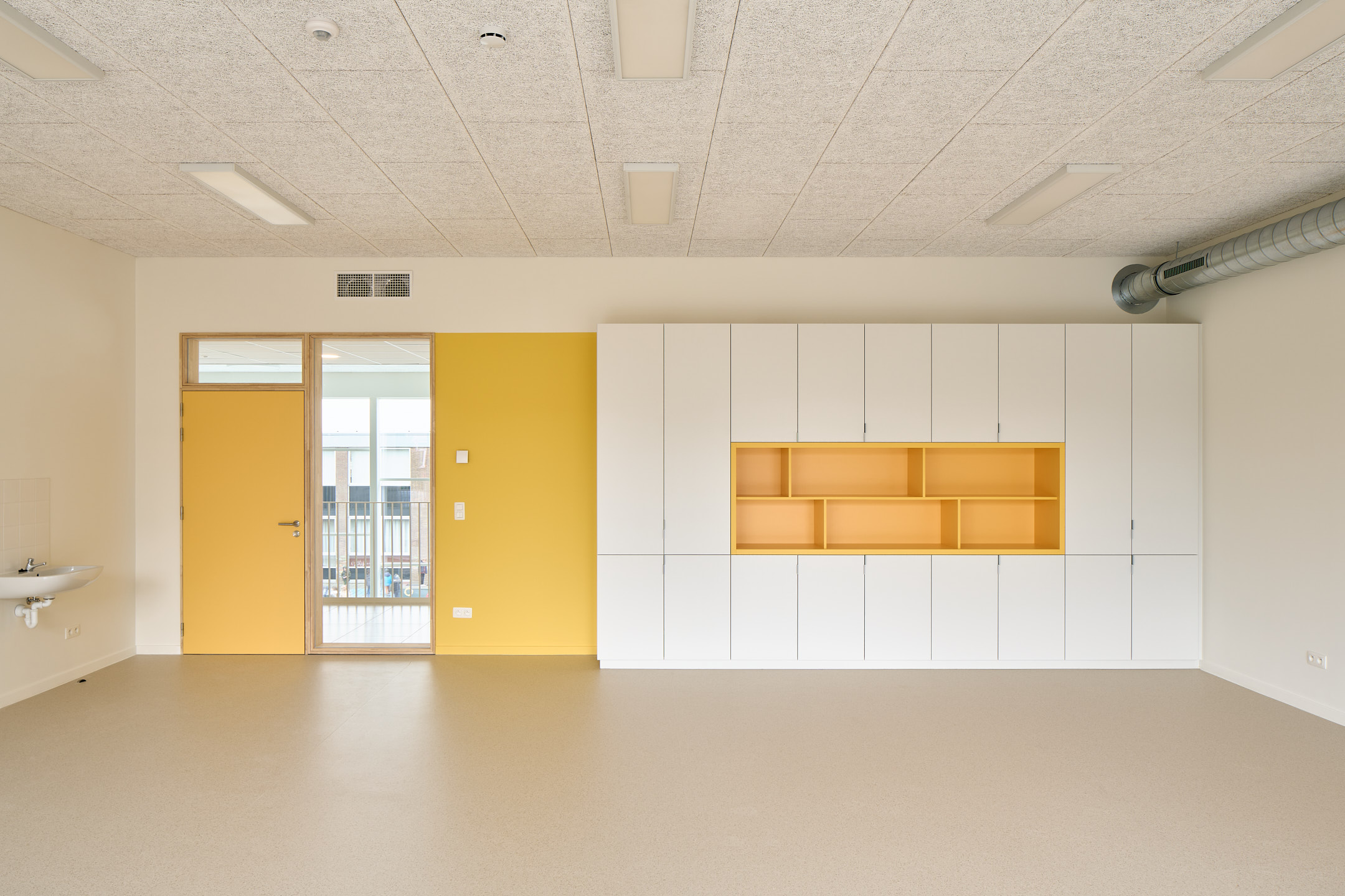 De kleuterklassen zijn strategisch gekoppeld aan de speelplaats en de klasgebonden tuintjes, zodat de jongste leerlingen hun eerste ontdekkingen kunnen doen in een speelse en nieuwsgierige setting. Twee polyvalente ruimtes verbinden de klassen, wat ruimte biedt voor een flexibel en breed pedagogisch concept dat inspeelt op de uiteenlopende leerbehoeften van de kinderen.