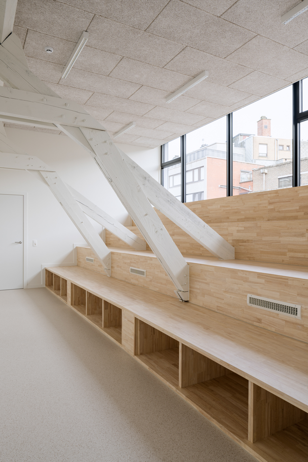De ingrepen versterken de historische gelaagdheid van het gebouw, waarbij oude elementen zichtbaar blijven en samensmelten met nieuwe, natuurlijke materialen. Zo ontstaat een toekomstbestendige school die niet alleen onderwijs faciliteert, maar ook een sociaal ankerpunt vormt in de stedelijke context.