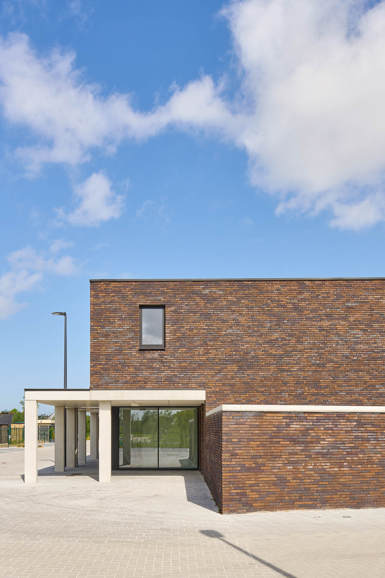 Een luifel uit zichtbeton verbindt alle woningen met elkaar en vormt de relatie met het openbaar domein. De grenzen tussen publiek en privaat en tussen binnen en buiten vervagen terwijl deze luifel interessante belevingsruimtes creƫert. De strakke ritmiek van de overdekte ruimte structureert het geheel en geeft een gevoel van ruimtelijke collectiviteit.
